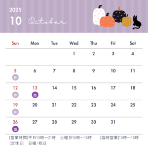 今月は、13日(月)、26日(日)が臨時営業になっております。